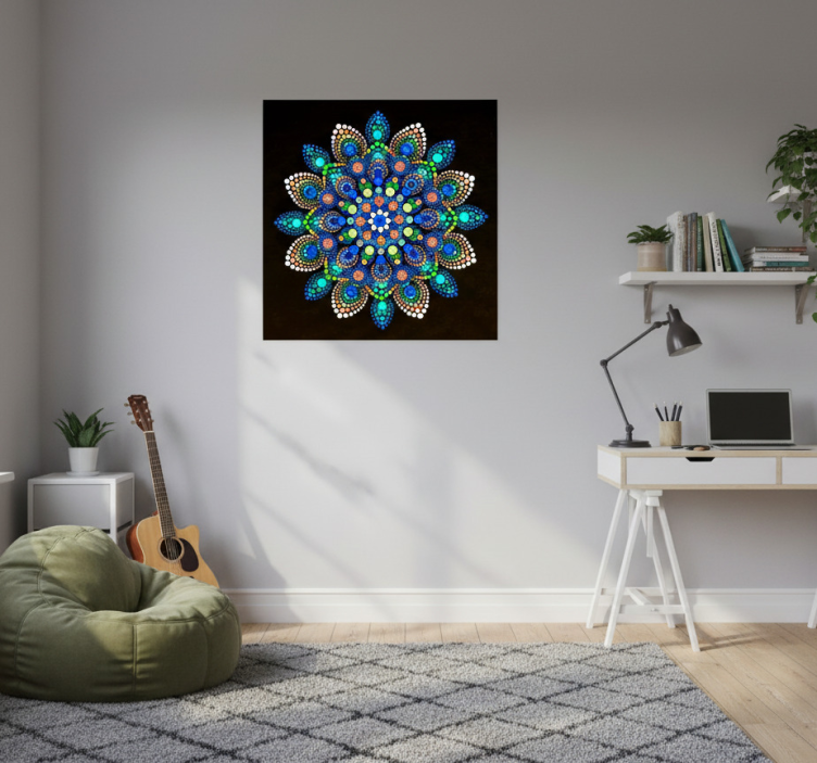 这幅引人注目的艺术作品展示了一个生动的曼荼罗设计,装饰着复杂的图案。它融合了鲜艳的蓝色、绿色和橙色,背景则是深色的。圆形的图案从中心向外辐射,形成一个美观的焦点,增强了周围空间的视觉效果。
