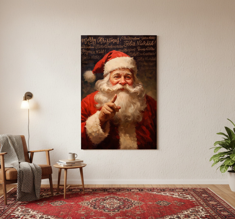 一幅节日艺术作品,描绘了圣诞老人,身穿传统的红色套装,配有蓬松的白色边缘。他愉快的表情传达出温暖和欢乐。背景展示了多种语言的节日问候,增强了节日的氛围。温馨的室内环境衬托了这一迷人的画面。