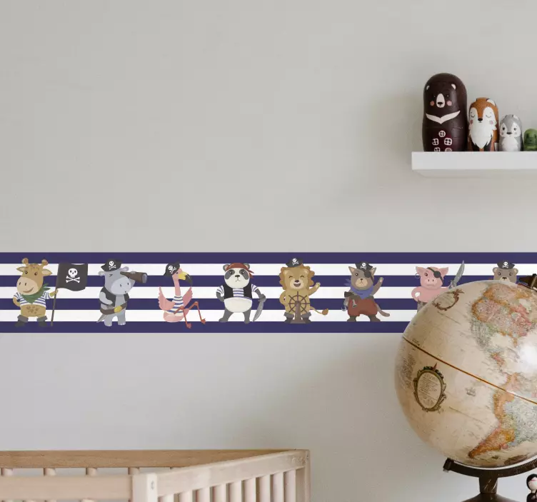 參考:: A47219一组充满活力的海盗主题动物角色,以俏皮的姿态展示。每个动物都佩戴着各种海盗配饰,营造出一种愉快而冒险的氛围,非常适合儿童空间。设计中融入了条纹元素,为整体主题增添了时尚的海洋气息。