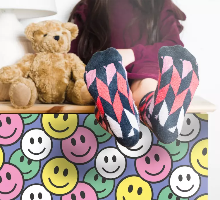 一幅充满欢快气息的作品,微笑的面孔以生动的图案排列,营造出欢乐和积极的氛围。鲜艳的色彩混合增强了这种设计的趣味性,非常适合儿童友好的环境。
