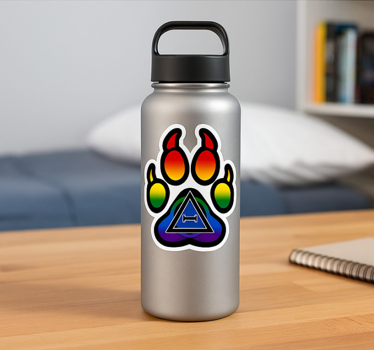 一个金属水瓶上有色彩斑斓的爪印设计,充满了红色、黄色、绿色和蓝色的渐变,象征着活泼的能量和与自然的联系。附带的几何形状增添了现代时尚感,强调个性。它非常适合那些欣赏独特和艺术化饮水解决方案的人。