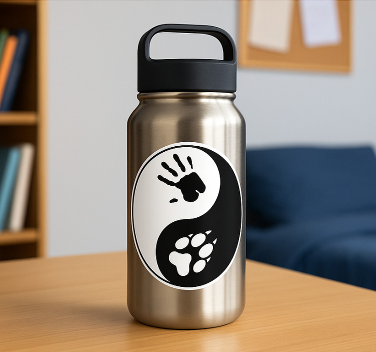 一个光滑的金属容器上具有引人注目的 yin-yang 设计,结合了人类手印和爪印。这象征着自然与人类之间的和谐,突显了所有生物的相互联系。对比鲜明的视觉效果创造了引人注目的美感,非常适合自然爱好者和动物福利倡导者。
