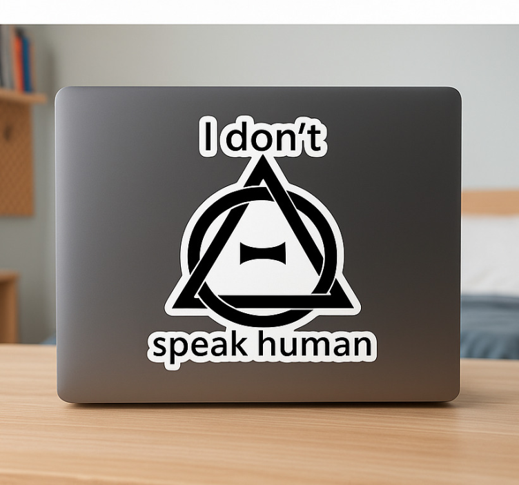 这件作品以引人注目的几何设计为特色,体现了现代艺术与幽默的独特融合。引用的句子'I don't speak human' 俏皮地暗示了一种超然的态度或另类的沟通方式,吸引那些与个性和创造力产生共鸣的人。非常适合个性化笔记本电脑或类似的表面。