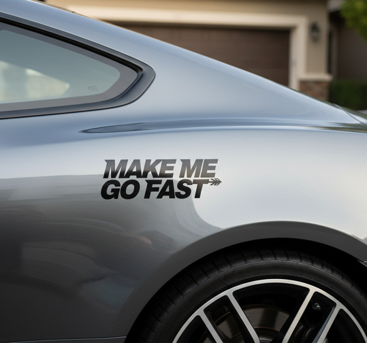 一辆流线型的车辆在后部具有大胆的设计元素,传达出速度感和对驾驶的热情。短语 'MAKE ME GO FAST' 强调了玩乐和冒险的精神,吸引了那些欣赏性能和公路刺激的汽车爱好者。