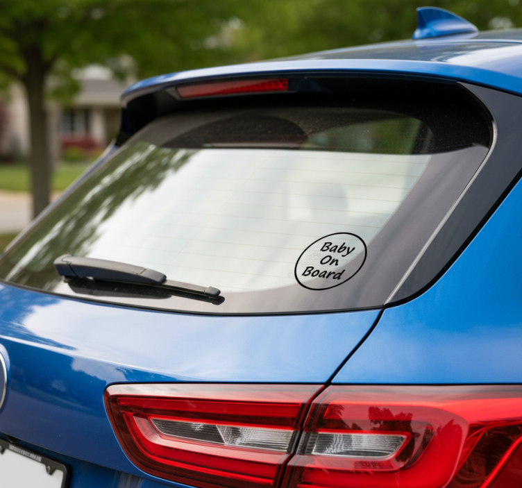 一个圆形设计位于车辆的后窗上,传达了一个关于道路安全的重要信息。短语 'Baby On Board' 表示车内有婴儿,提醒其他驾驶者在驾驶时要谨慎和保持警觉。