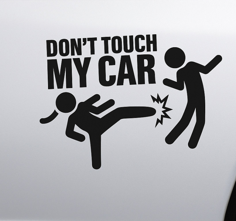 一个幽默的设计展示了一个人踢另一个人的有趣场景,并配以短语'DON'T TOUCH MY CAR'。这句话强调了个人空间的强烈感受和尊重财产的重要性,为车主传达了一种轻松而又坚定的信息。