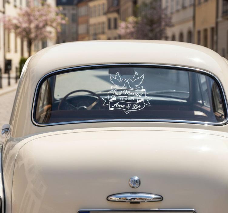 一辆复古车辆装饰着迷人的设计,描绘了两只象征爱与和平的鸽子。设计中包含了一条节日横幅,上面写着 'Just Married' ,以及可定制的名字和日期,非常适合庆祝婚礼的喜庆场合。这一优雅的装饰提升了节日的气氛。