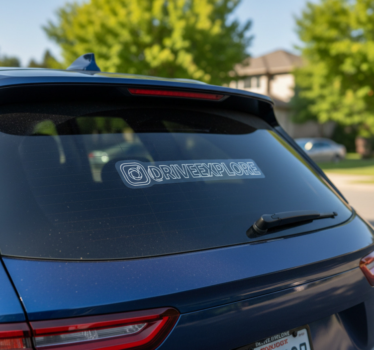 后窗设计通过短语‘@DRIVEEXPLORE’鼓励探索和冒险。这传达了对旅行和发现的热情,邀请他人共同参与探索新地方和体验的旅程。这个意象唤起了对旅行的渴望和好奇心,非常适合任何户外爱好者。