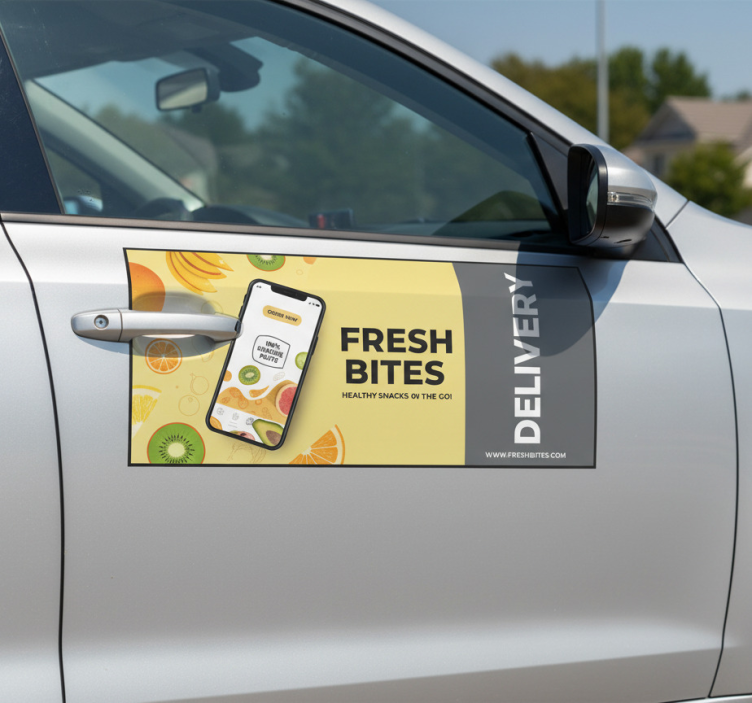 一则生动的广告展示了一款移动应用界面,展示了各种新鲜小吃,并配以色彩丰富的水果插图。短语 'healthy snacks on the go' 强调了便利和健康,吸引了忙碌的生活方式。整体设计有效地吸引了注意力,同时推广了一项配送服务。