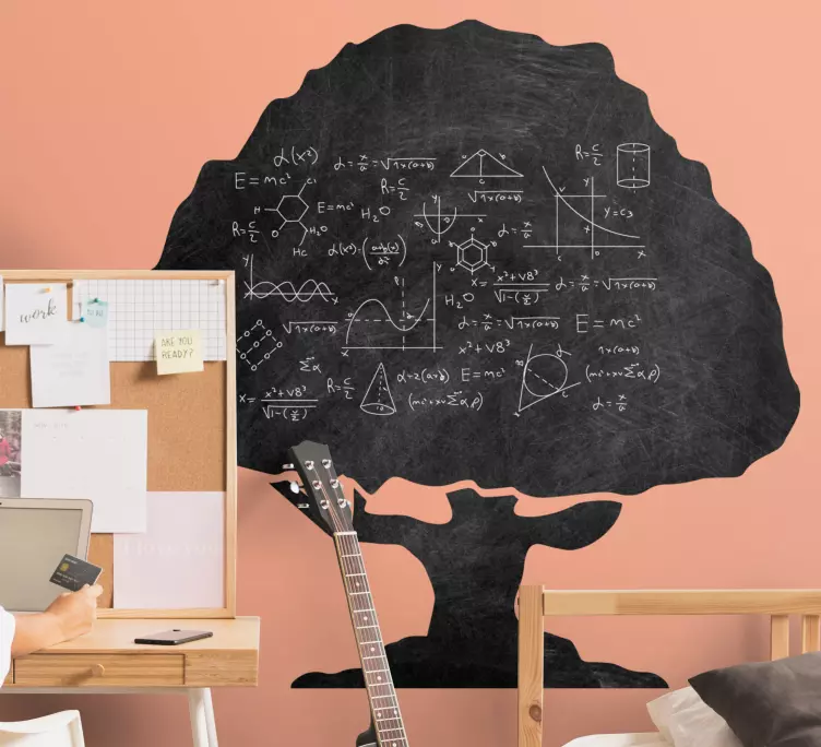 參考:: A48895一棵树的引人注目的轮廓中融入了科学方程式和图表,象征着自然与知识的融合。这个设计体现了一个富有创意的学习空间,激发学习和好奇心,非常适合教育环境。