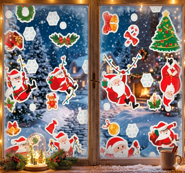 一个迷人的节日窗户装饰,展示了各种顽皮的圣诞老人形象,他们正在愉快地进行各种活动。装饰元素包括圣诞礼物、欢快的饰品和雪花,带来了令人愉悦的节日气氛。短语 'Believe in the magic of Christmas' 强调了在节日期间希望和快乐的重要性。
