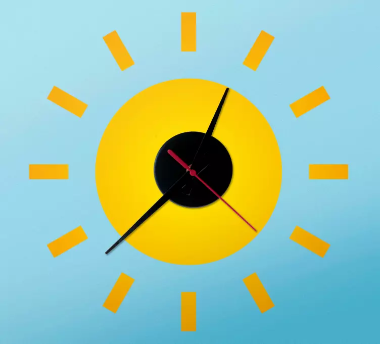 參考:: A49340这是一款充满活力的以太阳为灵感的时计,中央是一个明亮的黄色圆圈,周围环绕着延伸的光芒。设计将功能性与俏皮的美学相结合,成为任何空间的引人注目的装饰。它以阳光明媚、愉快的方式展示了时间的美。