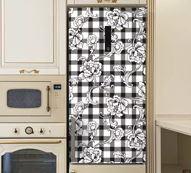 一种美丽的花卉图案与格子图案的结合,为厨房空间增添了一丝时尚感。这个设计展示了复杂的花朵与经典的黑白棋盘交织在一起,创造出引人注目的视觉效果,提升了任何家居环境。