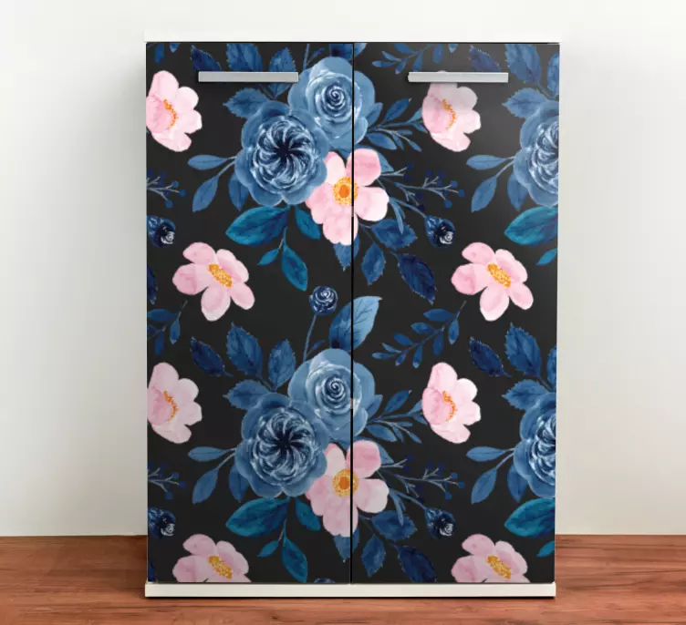 參考:: A51591一个迷人的花卉图案,融合了蓝色和粉色的花朵,衬托在深色背景上。这个设计为任何装饰的空间增添了生动而清新的气息,理想用于增添自然之美的色彩。