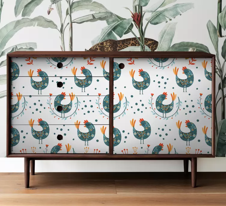 參考:: A51359这个生动的设计展示了一系列装饰着花卉细节和俏皮色彩的奇幻公鸡。色彩鲜艳的元素组合营造出一个温馨而愉快的氛围,非常适合充满玩乐的空间。
