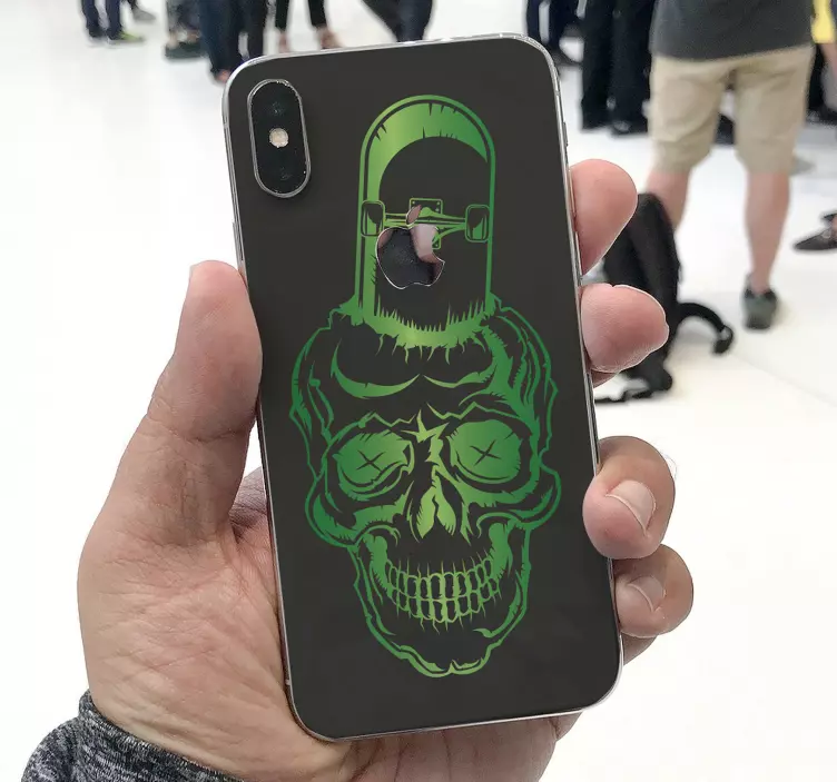 欢迎来到我们的独特设计世界!这款 iPhone贴纸绿色骷髅设计 采用了活泼的绿色色调,结合了颅骨和滑板的元素,为您的手机增添了无限个性。无论您是在拨打电话,还是在滑板上飞驰,这款贴纸都将成为您生活的一部分,展现出独特的时尚态度。