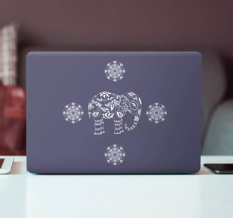 一幅复杂的象征性图案,框住了一只大象,周围环绕着装饰性的圆形图案。这个设计将艺术性与魅力结合,为笔记本电脑表面赋予了独特的个性。大象象征着智慧和力量,使这件作品既吸引人又富有深意。