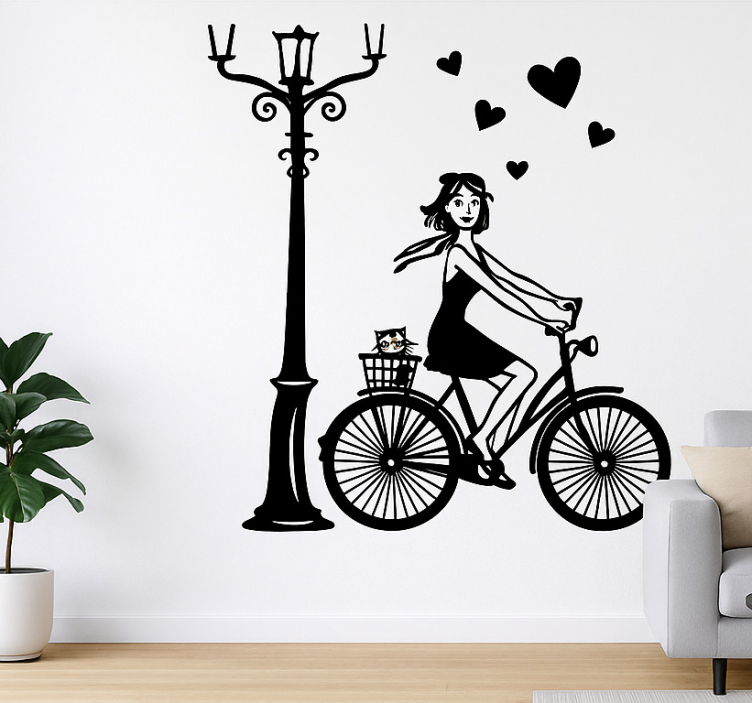 一个充满幻想的场景,描绘了一位女孩在街灯下快乐地骑着自行车,车篮里还放着她的宠物。空中飘浮着心形图案,为设计增添了一丝浪漫和趣味。这幅画面唤起了自由和爱的感觉,非常适合提升家居装饰的氛围。