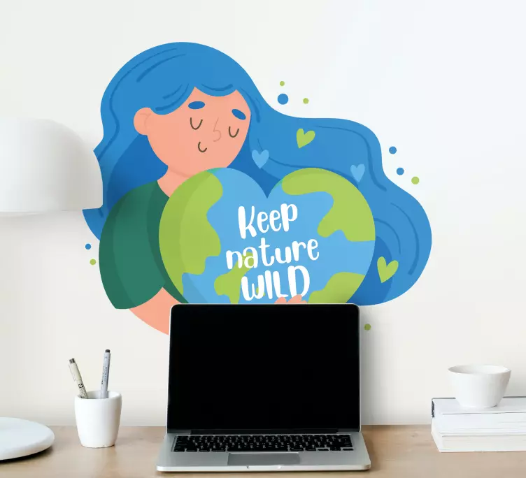 一个强调关爱我们星球重要性的表现,框架中有一个角色温柔地握着一个心形的地球。这个短语鼓励人们承诺保护自然的野性,突显与地球的爱与连接。