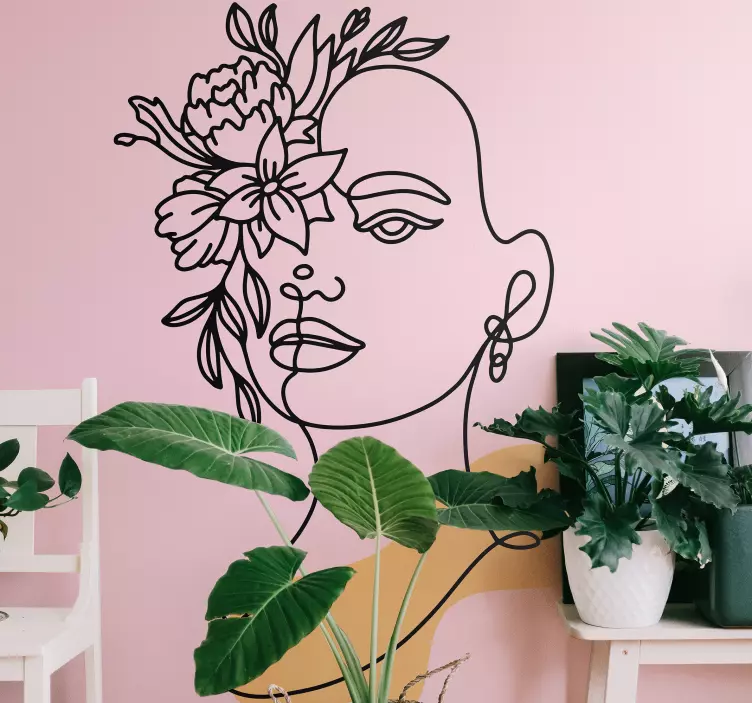 一幅引人注目的作品,展示了一幅极简线条画,描绘了一位女性的面孔,脸上点缀着各种花朵。这幅作品融合了女性气质与自然之美,和谐地聚焦于优雅与美丽,非常适合为任何居住空间增添艺术气息。