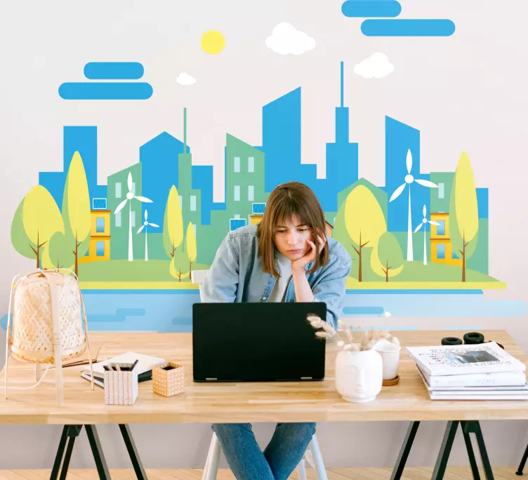 欢迎来到我们的放置贴纸现代城市风景产品世界!这款独特的设计融合了现代城市的独特魅力,展现出高耸的摩天大楼、优美的城市景观以及生动的插图。在这幅作品中,建筑物的轮廓清晰可见,树木与水面相映成趣,风力涡轮机在阳光下闪闪发光,为整个场景增添了一丝生机与活力。无论您是想要装饰家居还是办公室,这款贴纸都能为您的空间注入现代气息。