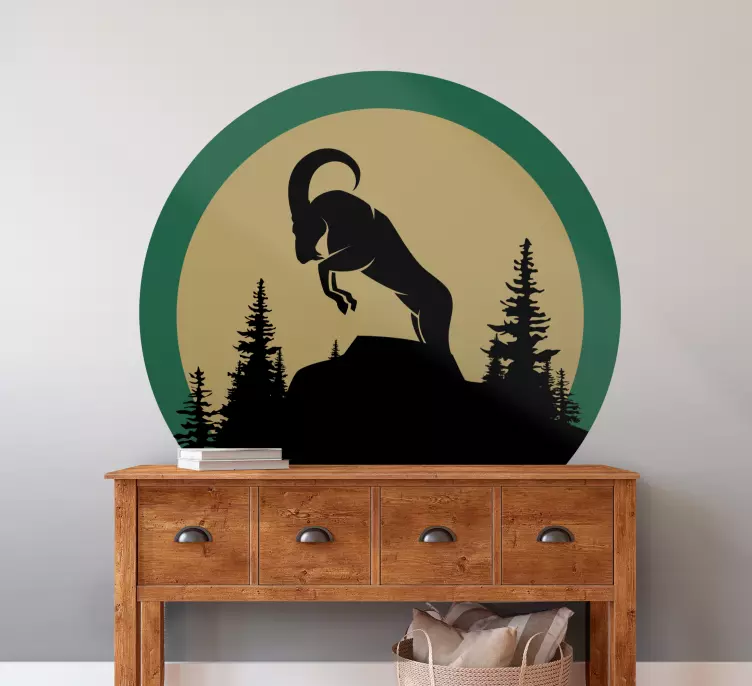 一只山羊跃起时的引人注目的轮廓,四周环绕着高耸的树木,背景是柔和色彩的圆形。这一设计唤起了冒险的感觉和野生动物的精髓,完美适合那些受到自然和户外生活启发的人。
