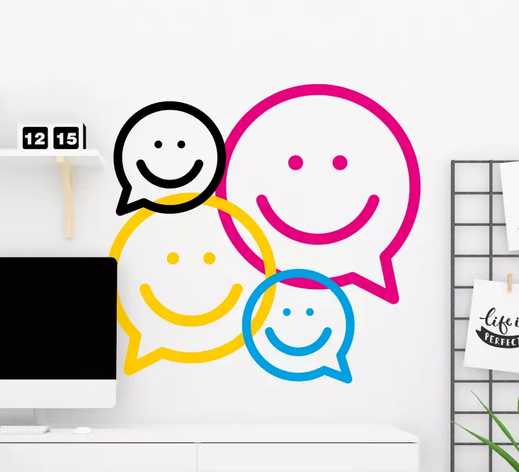 一组不同大小和颜色的笑脸以俏皮的方式排列,象征着快乐和交流。这些带有对话气泡的欢快图标唤起情感,营造出一种生动的氛围,非常适合旨在激发积极性的空间。