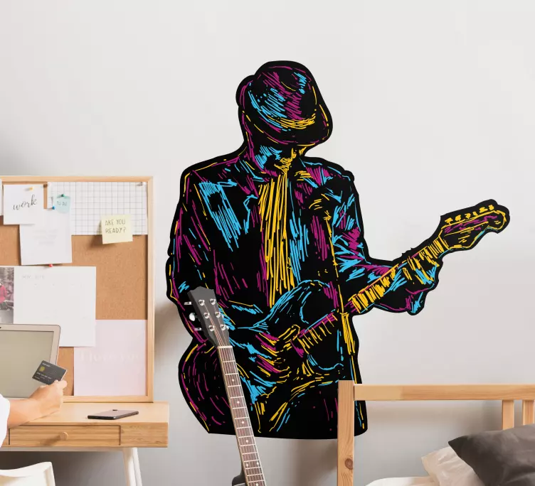 体育贴纸动物贴画五彩吉他手剪影非常适合在任何平坦的表面上应用。无论是墙壁、家具还是任何您想装饰的地方,它都能轻松贴上,瞬间改变空间的氛围!