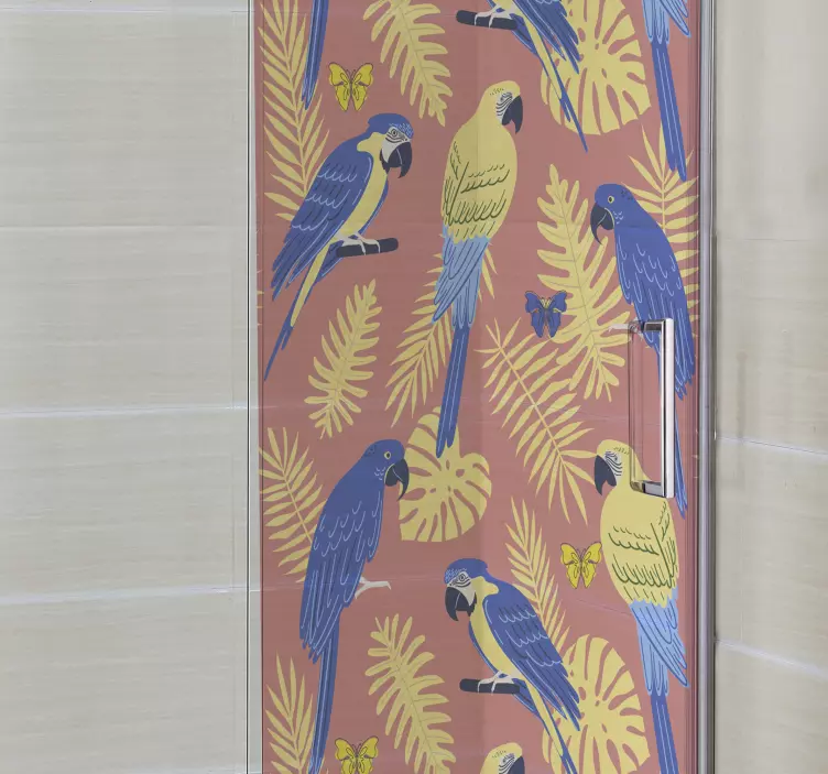 欢迎来到我们的产品展示,今天为您介绍的是这款独特的淋浴贴纸彩色鹦鹉图案。这款设计灵感来源于热带自然,生动的金刚鹦鹉与丰富的树叶交织在一起,蝴蝶轻盈飞舞,形成了一幅色彩斑斓的景象。设计中的黄色与蓝色相互辉映,给人一种充满活力的感受,仿佛置身于热带雨林的怀抱。无论是在淋浴门还是墙面,这款贴纸都能为您的空间增添一份自然的气息。