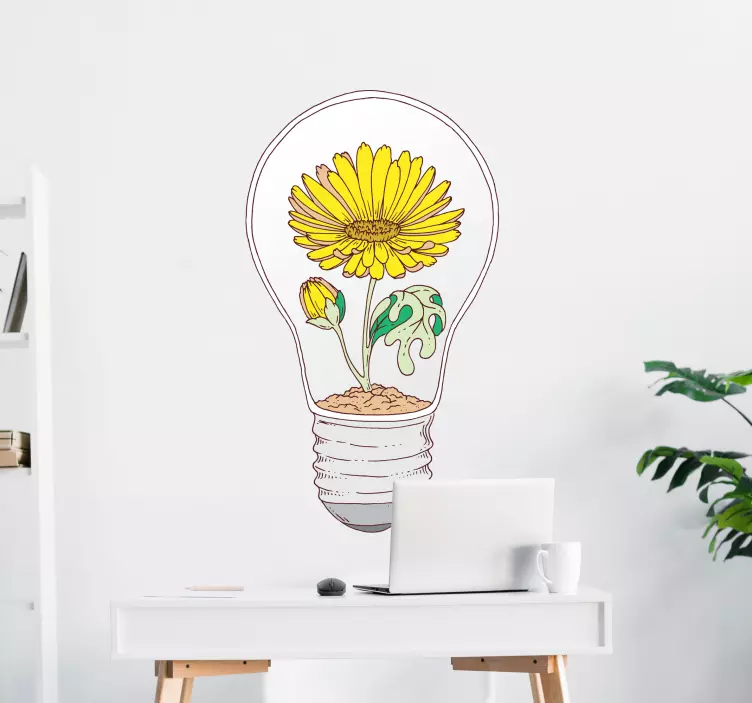 欢迎来到我们的动物贴画盛开的灯泡产品介绍!这款独特的设计灵感来源于自然的美丽,灯泡如同一朵盛开的向日葵,周围环绕着生机勃勃的树叶和花朵,展现出一种自然生长的概念。明亮的黄色插图为室内空间增添了一丝活力与温暖,让每一个角落都充满生机。