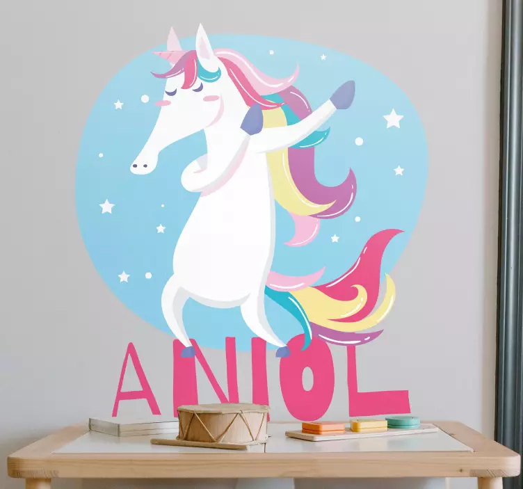 一只充满活力的 unicorn 在宁静的蓝色背景下欢快地舞动,周围环绕着星星。这个设计捕捉了童年和想象力的奇妙精神,使其成为个人空间的绝佳选择。该产品可以进行个性化定制,以增添独特的风格。