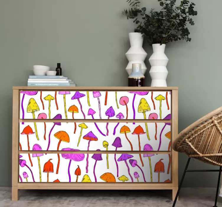 參考:: A49426这个充满活力的设计展示了各种颜色和形状的蘑菇。这种生动的构图为任何空间增添了一丝奇幻和清新,提升了其美学吸引力,同时庆祝自然的美丽。