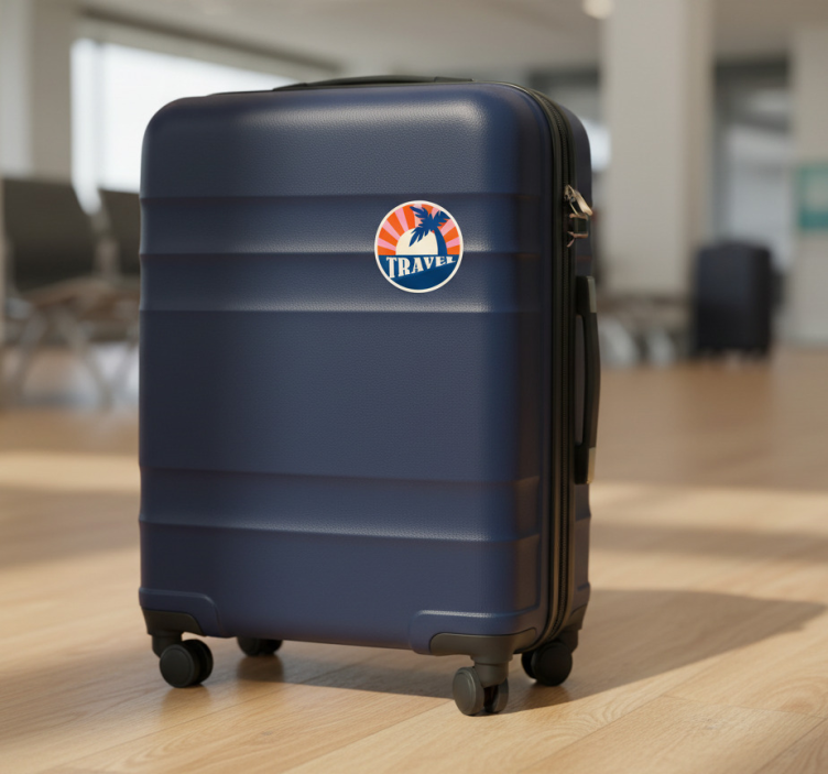 一款耐用的行李箱,展现出充满活力的设计,激发人们的旅行欲望。圆形图案捕捉了热带氛围,描绘了一棵棕榈树的剪影,背景是日出的景象。引用的词语'TRAVEL'唤起了冒险和探索的精神,鼓励人们前往新的目的地。