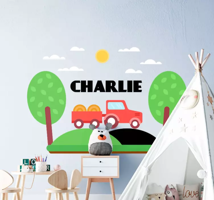 參考:: A52091一个生动的场景,描绘了一辆红色卡车在郁郁葱葱的绿色山丘上运输货物,周围是风格化的树木和明亮的太阳。这幅作品为任何空间增添了俏皮的气息,非常适合儿童房,同时也允许个人化定制。