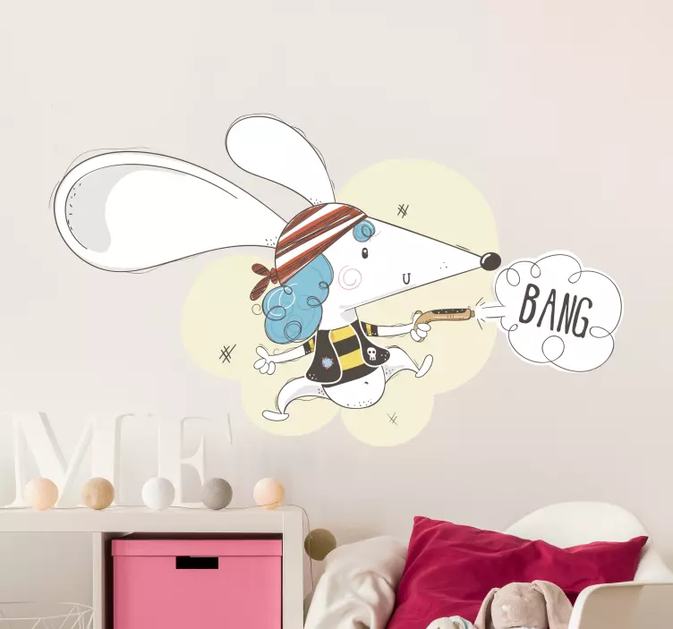 一幅生动有趣的卡通画,描绘了一只穿着海盗服装的小鼠,配有条纹帽子和蓝色头发。这位奇幻角色手持玩具,兴奋地喊出'BANG',增添了乐趣和冒险的感觉,非常适合儿童的空间。