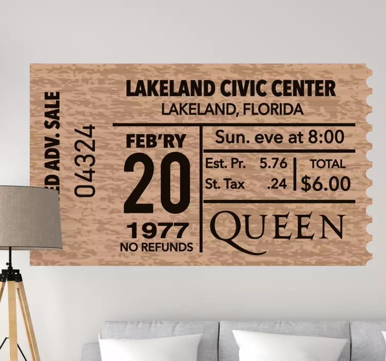 參考:: A49733一张来自Lakeland Civic Center的复古票据,记录了1977年2月20日Queen的演出。这一设计突显了现场音乐活动的历史意义,展示了包括地点、日期和票价等票务细节,吸引音乐爱好者和收藏家。