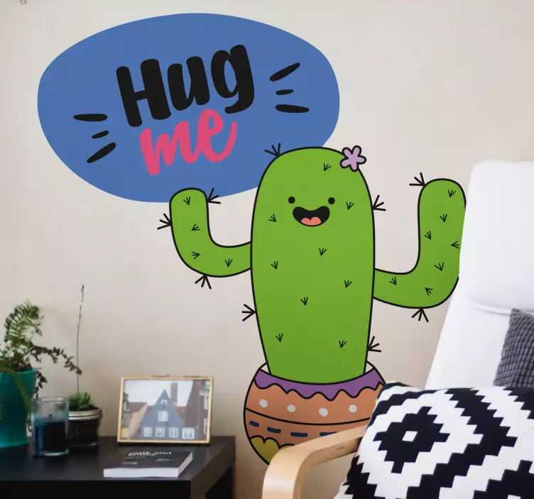 一个欢快的仙人掌角色,面带友好的微笑,装饰着鲜艳的花朵和五彩缤纷的花盆。它有一个顽皮的对话框,里面鼓励拥抱,为整体设计增添了一丝轻松愉快的气息。