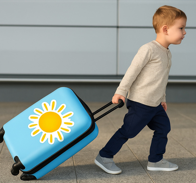 一个孩子自信地拉着一个充满活力的旅行箱,体现了冒险和快乐。这个箱子上有一个快乐的太阳设计,象征着幸福和温暖,唤起了一种乐趣和兴奋的感觉。这幅图像捕捉了探索的精神,非常适合希望一起旅行的家庭。