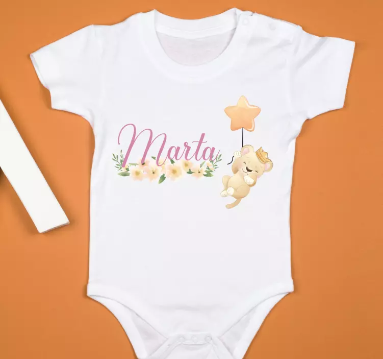 这个迷人的设计展示了一只可爱的熊抱着一颗星星气球,搭配精致的花卉元素。名字'Marta'优雅地融入到艺术作品中,营造出一种愉悦而个性化的感觉,非常适合婴儿服饰。