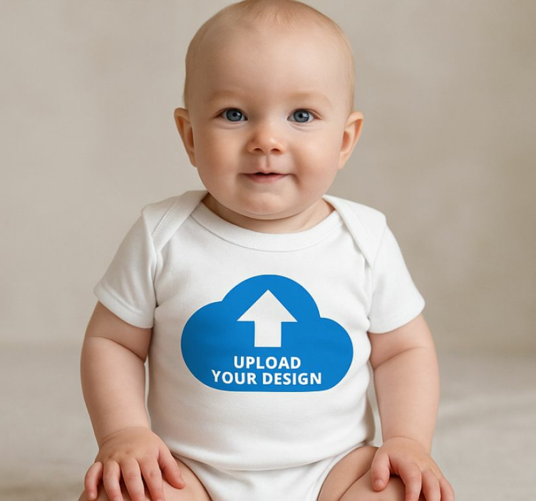 一个快乐的婴儿穿着印有鲜艳蓝色云朵图案的白色连体衣,面向镜头微笑。设计中有一个指向上方的箭头,旁边写着 'UPLOAD YOUR DESIGN'。这件俏皮的服装非常适合展示定制服装,以其可爱而引人注目的方式吸引注意力。