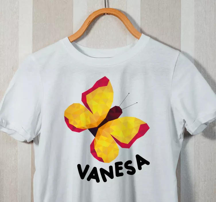这个迷人的设计展现了一只色彩斑斓的蝴蝶,融合了耀眼的黄色和红色调。几何形状增添了现代感,而名字的粗体字母则增强了其个人魅力。非常适合展示一种愉快和活泼的氛围。