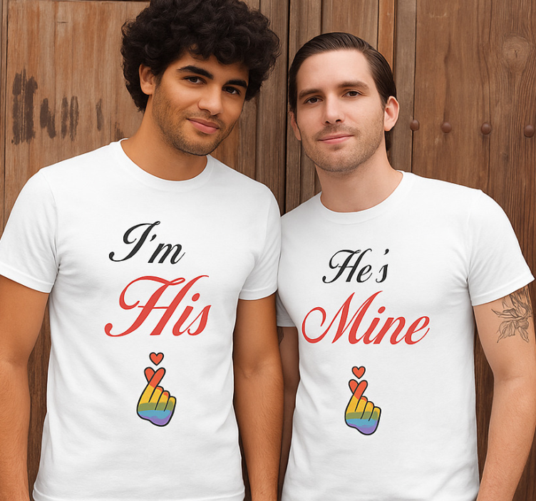 这张图片展示了两名男子自豪地穿着相配的T恤。每件T恤上都有独特的短语:一件写着'I'm His',另一件写着'He's Mine'。这些设计配有五彩缤纷的心形图案,庆祝爱与联系,象征着充满活力的LGBTQ+骄傲色彩的关系。