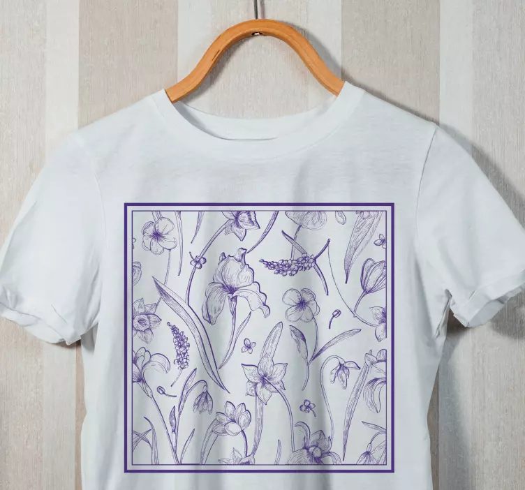 欢迎您了解我们的T恤衫植物图案排列设计!这款独特的T恤以番红花和各种花朵为灵感,呈现出一幅绚丽的紫色图案。每一朵花都仿佛在盛开,散发着自然的花香,搭配艺术插图和草图,营造出一种清新自然的氛围。无论是休闲外出,还是日常穿搭,这款T恤都能为您的服饰增添一份独特的艺术气息。