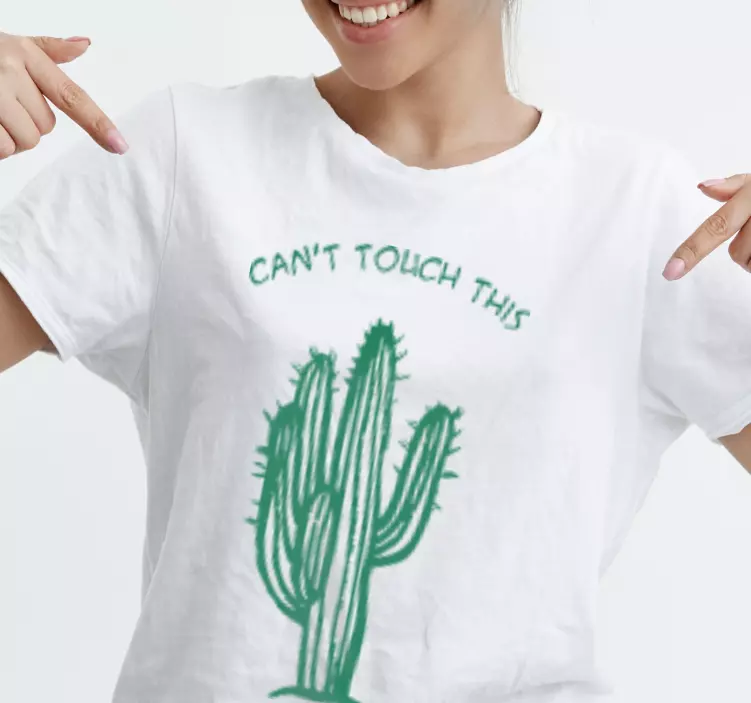 这个俏皮的设计展示了一棵仙人掌,上面写着'Can't Touch This'。鲜艳的绿色与白色面料形成了美丽的对比,成为一件适合休闲穿着的有趣声明单品。非常适合那些欣赏幽默和独特风格的人。