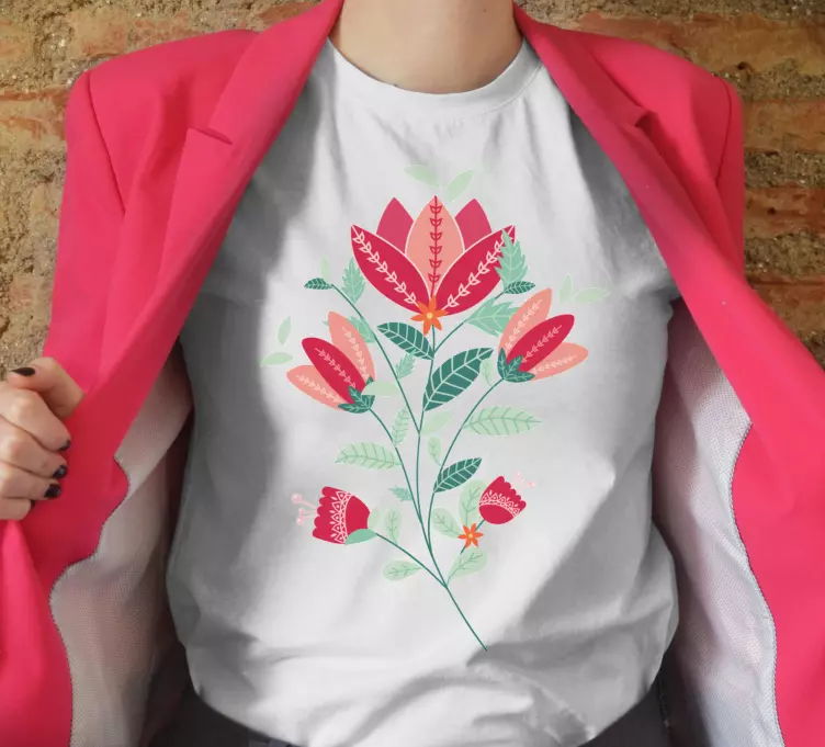 欢迎来到我们独特的T恤衫花卉盛开装饰设计!这款T恤的设计灵感源于自然界的美丽,展现了丰富多彩的花朵与生机盎然的春天气息。手绘的民俗风格与传统部落图案相结合,呈现出一种充满活力的植物装饰,让每一位穿着者都能感受到大自然的魅力与温暖。