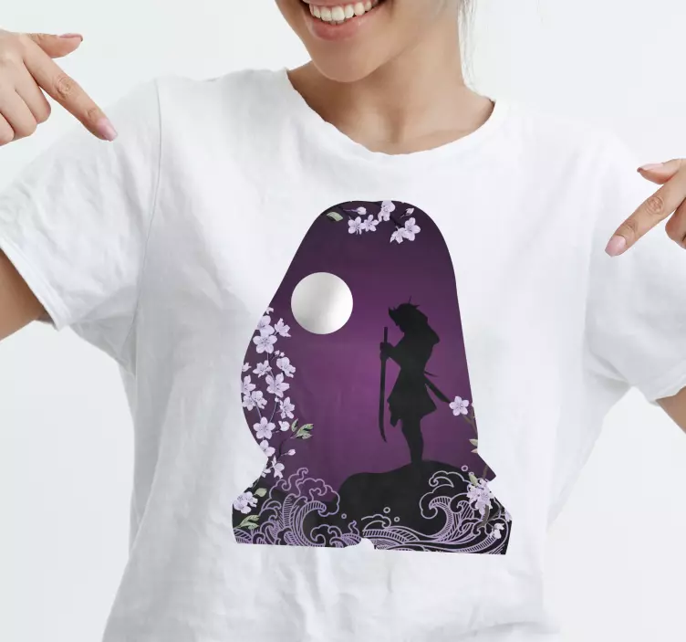 这件时尚单品在生动的紫色背景上描绘了一位战士的轮廓,周围环绕着樱花和月亮。花卉元素增添了一丝优雅,使其非常适合那些欣赏艺术、喜欢表达自我的个体。