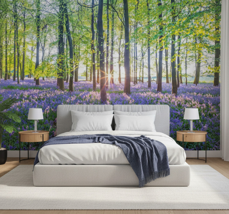 一幅令人惊叹的自然画面展现在眼前,鲜艳的紫色花朵铺满大地,周围是高大的树木,树叶新鲜翠绿。温暖的阳光透过森林洒下,给宁静的场景投射出美丽的光线,邀请人们进行平静的反思。