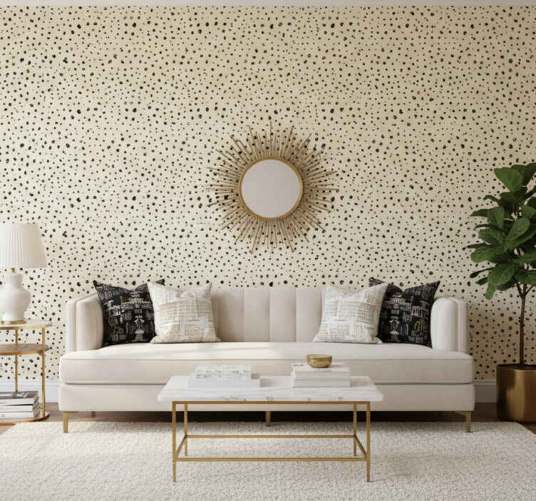 一个具有纹理的图案,展现了一系列不规则的黑点,衬托在柔和的米色背景上,营造出动态的视觉趣味。这些形状的俏皮分布为设计增添了现代感,提升了整体美感而不至于压倒其他设计元素,非常适合为任何空间增添独特的风格。