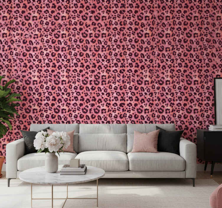 一种充满活力的图案,以深粉色和黑色的不规则豹纹点缀在柔和的粉色背景上。这个设计通过鲜明的对比增添了生动的气息,创造出一种吸引眼球的视觉节奏,为任何空间增添了动感的风格。