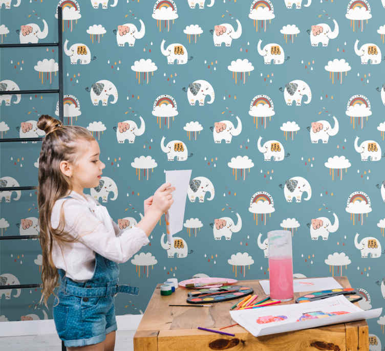 这款装饰墙纸采用哑光颜色制造,材质为无纺布壁纸。它以 50 厘米宽的卷筒形式生产和运输,并具有 M2 防火认证。设计包括大象、雨、卡通片、图案、云、彩虹、孩子们、俏皮的、三角形和 3D效果。墙纸大象嬉戏的大象游行,展现了大象在雨中嬉戏的卡通图案,令人惊叹。